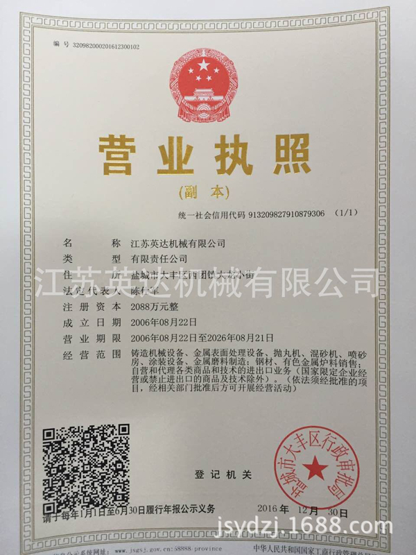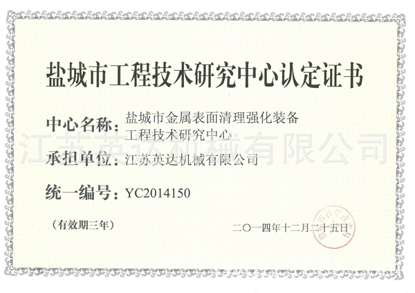 公司率先通過ISO9001:2008質(zhì)量管理體系認(rèn)證、ISO14001:2004環(huán)境管理體系認(rèn)證。擁有一支專業(yè)的技術(shù)團(tuán)隊,先后取得了網(wǎng)帶通過式拋丸機(jī)、新型機(jī)械回收噴砂房、輥道通過式重鋼拋丸機(jī)等三十項產(chǎn)品專利。(注:各項產(chǎn)品專利及所有證書詳見企業(yè)官網(wǎng):http://www.ydzj.net/或阿里誠信檔案)
